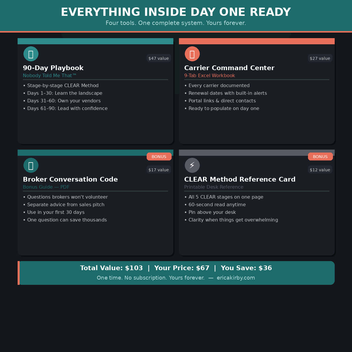 - Nobody Told Me That: The 90-Day Playbook ($47 value) โ Think of this as the experienced mentor you never had, condensed into a stage-by-stage roadmap that tells you exactly what to do, in what order, and why it matters. Stage by stage, it walks you through the CLEAR Method: from finding your broker and collecting your plan documents on day one, to running open enrollment with confidence on day 90. No theory. No jargon without translation. Just the straight-talk playbook that should have been handed to you the moment this role landed in your lap.