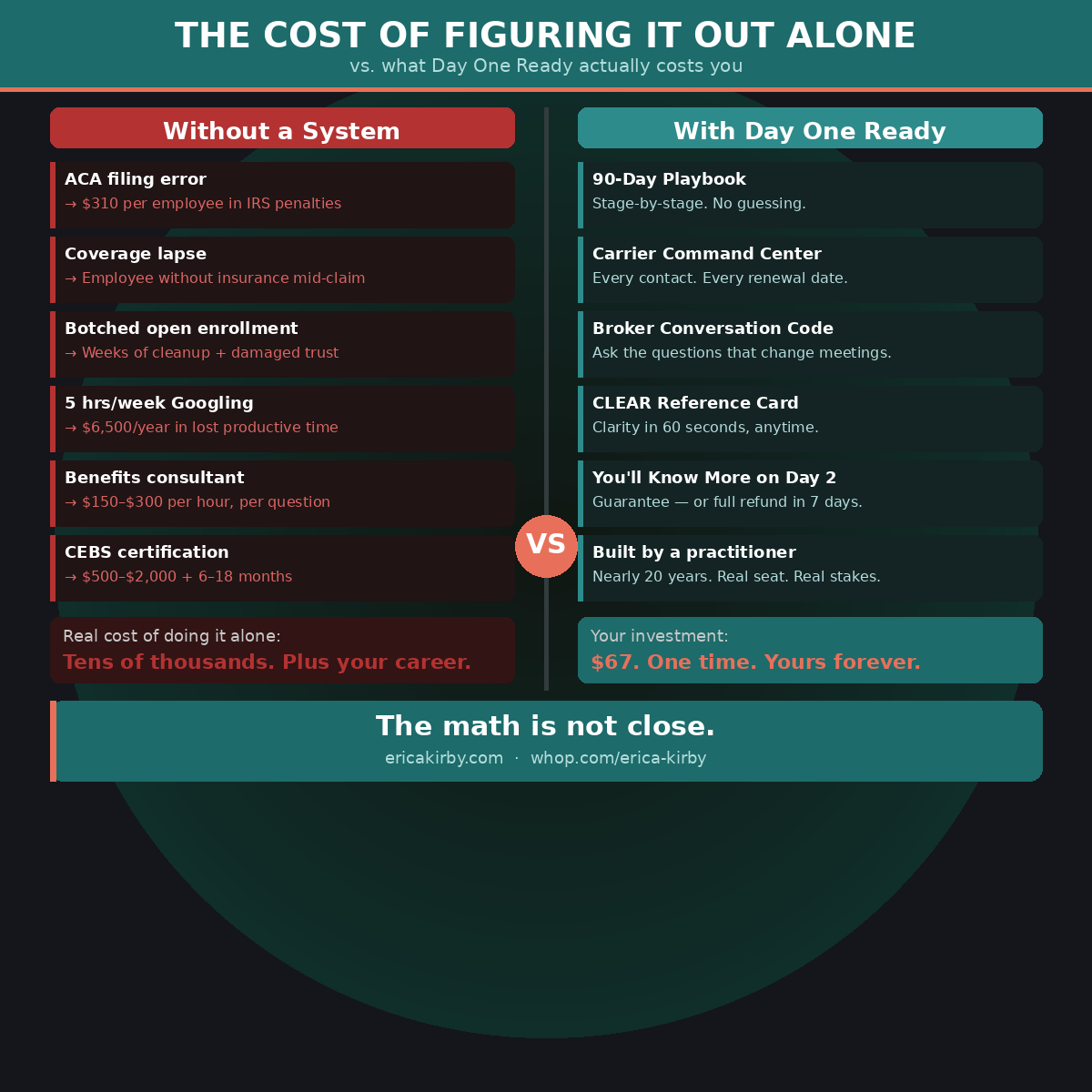 A benefits consultant charges $150โ$300 per hour for the knowledge in this kit. A benefits certification costs $500โ$2,000 and takes 6โ18 months. You are getting the practitioner knowledge, the operational infrastructure, and the conversation frameworks for $67. One time. No subscription. No renewal.